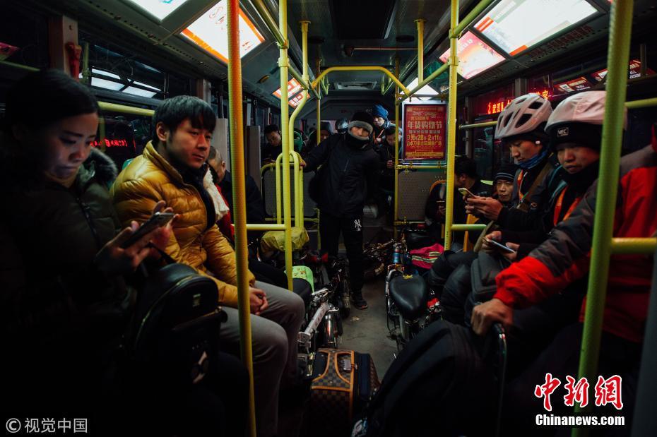 2018年2月7日,凌晨2点的武汉703路通宵公交车,车上大部分乘客都是代驾司机。年关将至,饭局酒局突然增多,代驾司机迎来了一年中最忙碌的时候。有的代驾司机干一个通宵能赚七八百元。图片来源:视觉中国