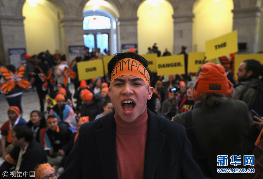 2月7日,美国华盛顿,移民示威者在拉塞尔参议院大楼集会抗议特朗普政府移民政策,要求国会保护“追梦人”计划。(图片来源:视觉中国)