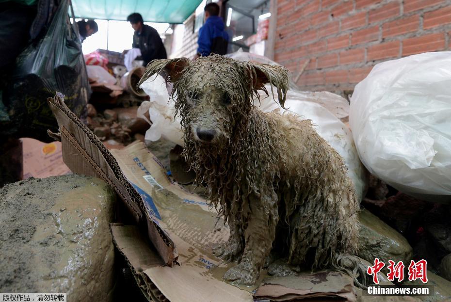 当地时间2018年2月7日,玻利维亚蒂基帕亚连遭暴雨引发洪水,大批民房被毁。图为一只浑身沾满泥水的狗。