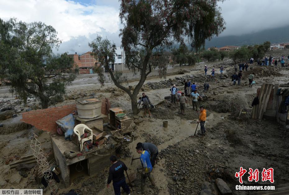 当地时间2018年2月7日,玻利维亚蒂基帕亚连遭暴雨引发洪水,大批民房被毁。图为民众清理洪水过后的废墟。