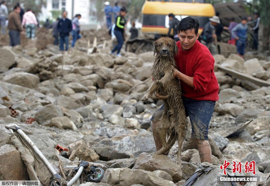 当地时间2018年2月7日,玻利维亚蒂基帕亚连遭暴雨引发洪水,大批民房被毁。图为当地民众在乱石中抱狗前行。