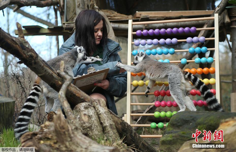 当地时间2月7日,英国伦敦动物园进行年度盘点,狐猴与调查员互动“点名”。
