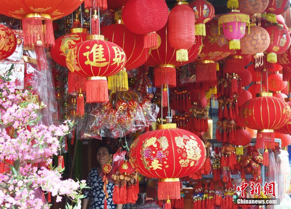 2月8日农历二十三是中国传统春节的“小年”,柬埔寨的华人华侨和中资企业喜好挂灯笼、贴春联,引来本地商人纷纷效仿。图为金边一家华裔商店。中新社记者 黄耀辉 摄