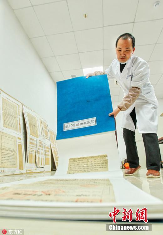 拿到一本待修复的古籍书册时,要对纸张进行检测,根据破损程度再确定修复方案,然后将书页一一分解,拆书、洗书、调浆、去泡、托裱……接着采取“湿补”“加固”等技法,让修补的部分与原书融为一体,最后压实、裁切和复原。“修复古籍是细腻繁琐的事情,环环相扣,需耐得住寂寞,而且要由简到难,慢慢总结经验和方法,我喜欢这样一边做事一边思考的状态。”朱履忠说。 图为古籍修复师朱履忠和他修复成册的《焦坑李氏家族契约》,全卷长度近100米。金刀雪钩 摄 图片来源:东方IC