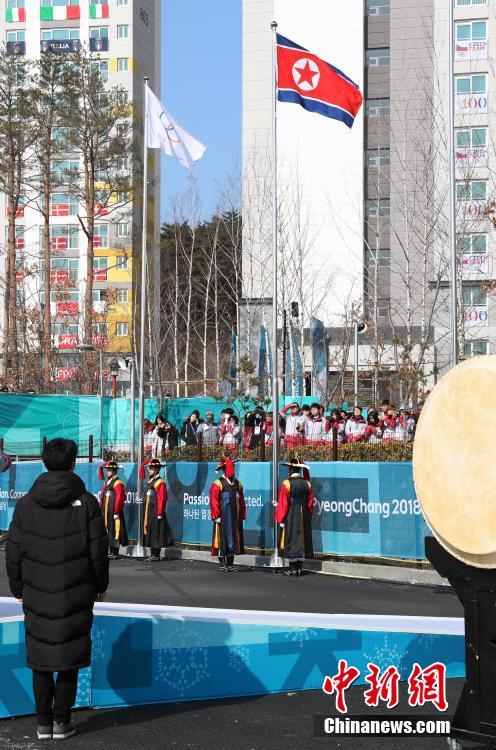 2月8日,朝鲜冬奥代表团在韩国江陵运动员村举行升旗仪式,受到众多媒体关注。中新社记者 宋吉河 摄
