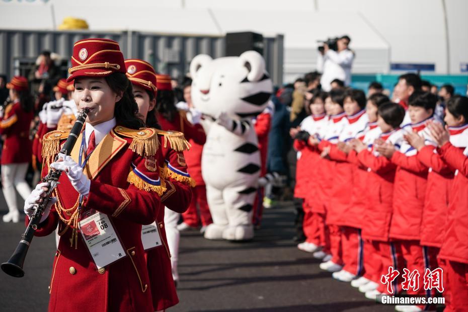 2月8日,朝鲜冬奥代表团在韩国江陵奥运村举行升旗仪式,吸引大批媒体关注。图为来自朝鲜的女子乐团为朝鲜运动员演奏助威。中新社记者 崔楠 摄