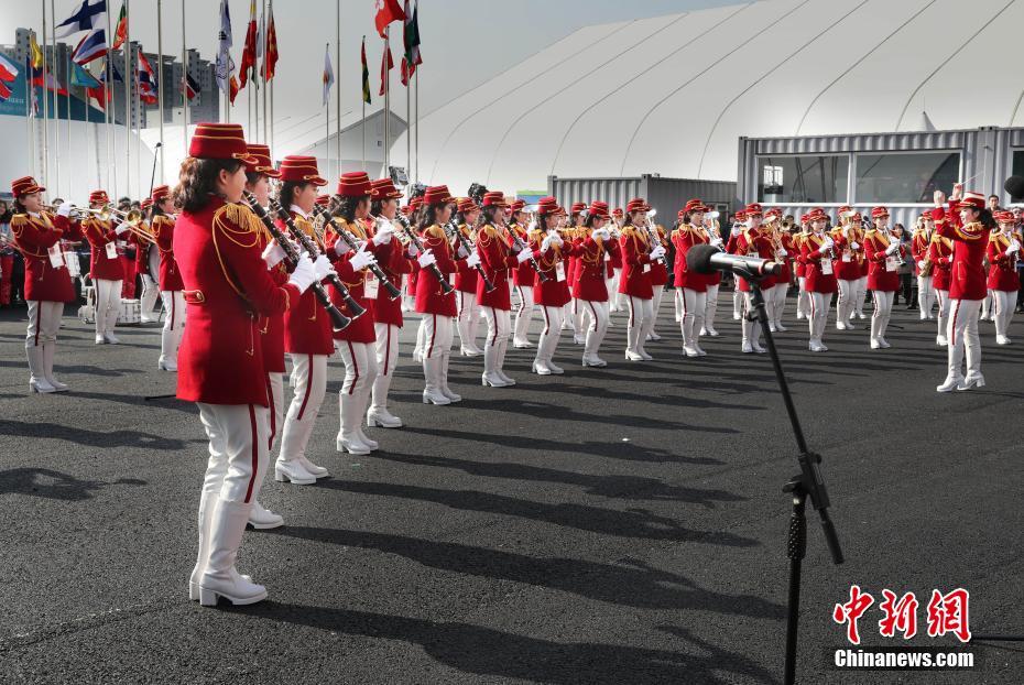 2月8日,朝鲜冬奥代表团在韩国江陵奥运村举行升旗仪式,现场进行演奏的女子乐队吸引了大批媒体的关注。中新社记者 宋吉河 摄