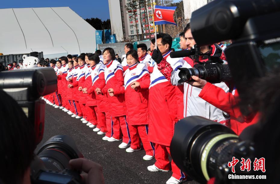 2月8日,朝鲜冬奥代表团在韩国江陵运动员村举行升旗仪式,受到众多媒体关注。中新社记者 宋吉河 摄