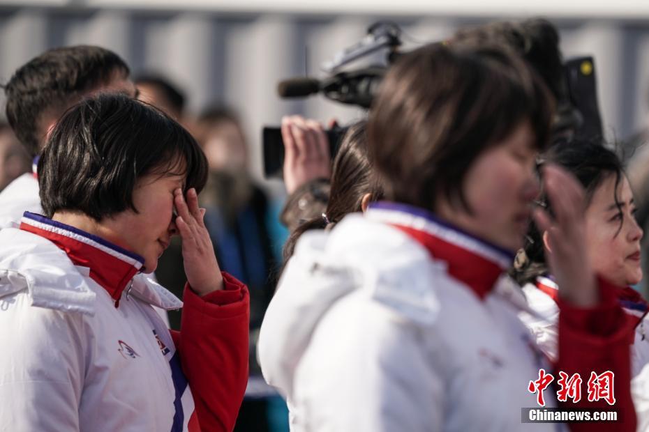 2月8日,朝鲜冬奥代表团在韩国江陵奥运村举行升旗仪式,吸引大批媒体关注。图为朝鲜代表团成员在听到国歌奏响后潸然泪下。中新社记者 崔楠 摄