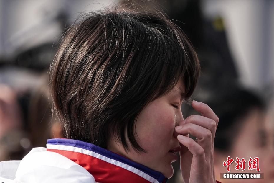 2月8日,朝鲜冬奥代表团在韩国江陵奥运村举行升旗仪式,吸引大批媒体关注。图为一名朝鲜运动员在听到朝鲜国歌奏响后潸然泪下。中新社记者 崔楠 摄