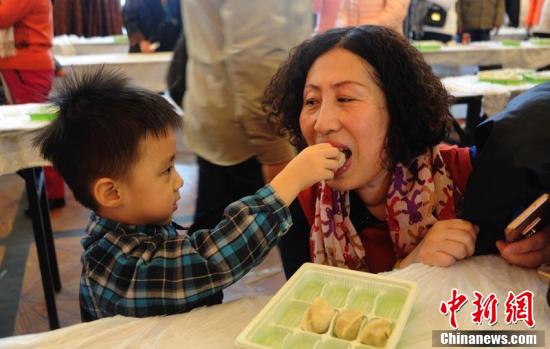 现场一位儿童给奶奶吃饺子。