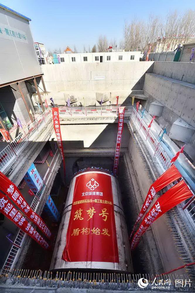 2月7日上午11:06,8.8米直径盾构“筑梦号”在北京新机场线磁各庄站北盾构始发井正式始发,为全线盾构段顺利贯通、早日移交铺轨打下良好基础。“筑梦号”盾构机是北京城建集团针对该工程长距离全断面密集卵砾石地层掘进的特点,专门采购的全新高性能辐条式土压平衡盾构机,刀盘直径为9.04米,主机长11.9米,整机总长120米,总重1409吨。由北京城建承施的北京轨道交通新机场线一期工程土建06标,全程3公里,为磁各庄站~1号区间风井区间段,包括明挖法盾构始发井、盾构法区间隧道和明暗挖结合施工的1号区间风井兼接收井。北京新机场轨道线为社会化引资项目,是一条连接中心城与新机场的轨道交通线路。线路定位为快速、直达、高品质的轨道交通专线,设计时速高达160千米/小时,在国内城市轨道交通领域尚属首次,列车采用架空式接触网供电。线路全长41.36公里,其中地下线23.65公里,地面高架及路基段17.71公里,全线设有北航站楼、磁各庄站和草桥站,共设有3站4区间,以及1座磁各庄车辆段,预留1座停车场。 “筑梦号”盾构机始发现场。人民网记者 雷声 摄