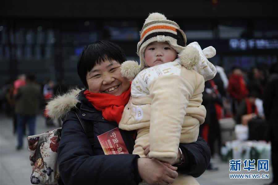 2月7日晚,在宁波火车站,一名老人抱着孙女准备和家人一起乘坐宁波至阜阳的“接您回家”农民工专列回家过年。
