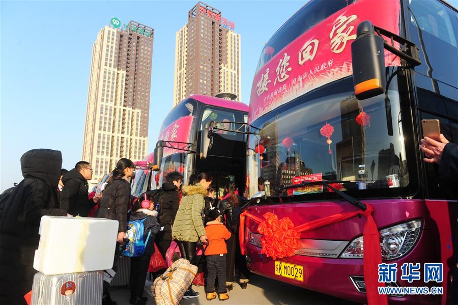2月8日,在安徽阜阳火车站广场,返乡农民工及家属排队乘坐“接您回家”免费大巴。