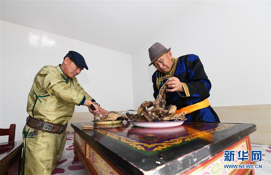 2月8日,父亲乌图那顺(右)与其格其勒图的哥哥赛音吉日嘎拉在分割羊胸叉。