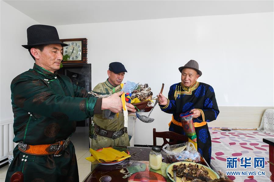 2月8日,父亲乌图那顺(右三)用松枝烟熏羊胸叉,对祭品进行净化洗礼。
