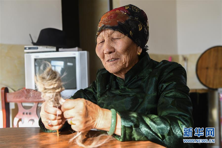 2月8日,其格其勒图的母亲乌珍巴拉将羊毛编织成绳索。