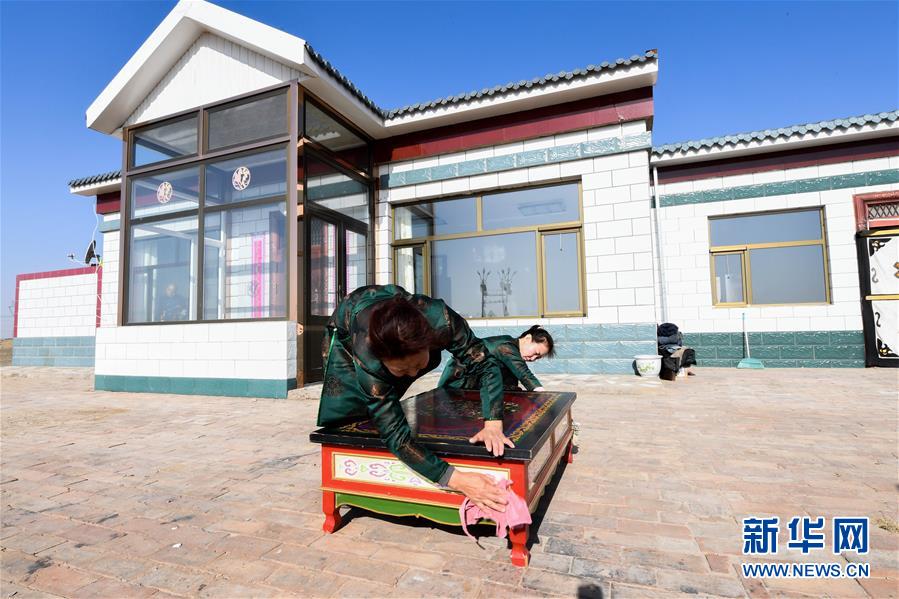 2月8日,其格其勒图的妻子娜仁(前)与女儿努功擦洗餐桌。
