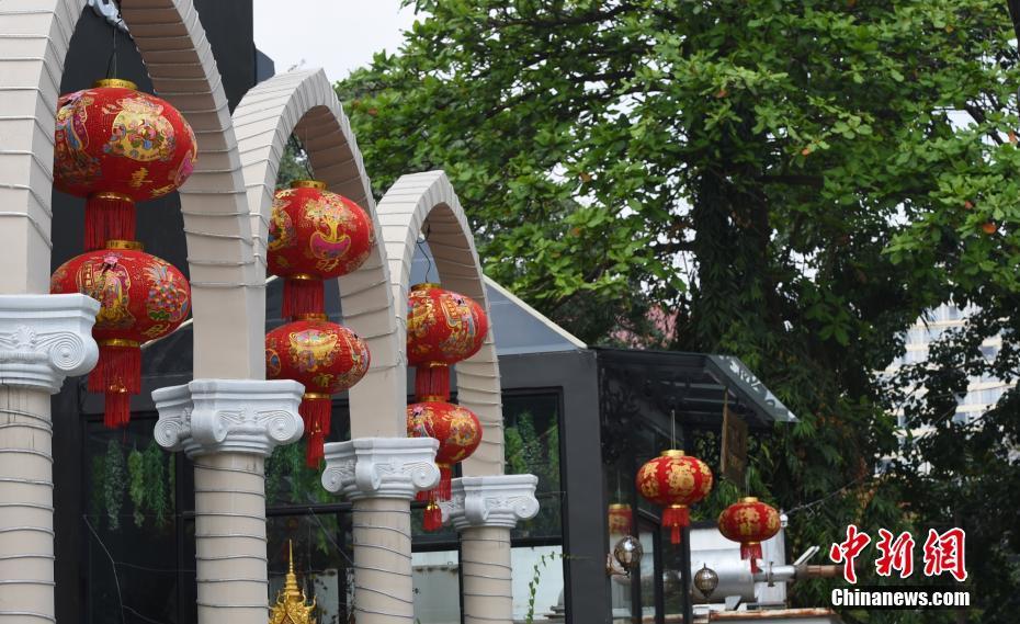 2月8日农历二十三是中国传统春节的“小年”,柬埔寨的华人华侨和中资企业挂灯笼、贴春联,迎接佳节,图为金边街头挂起的节庆装饰。中新社记者 黄耀辉 摄