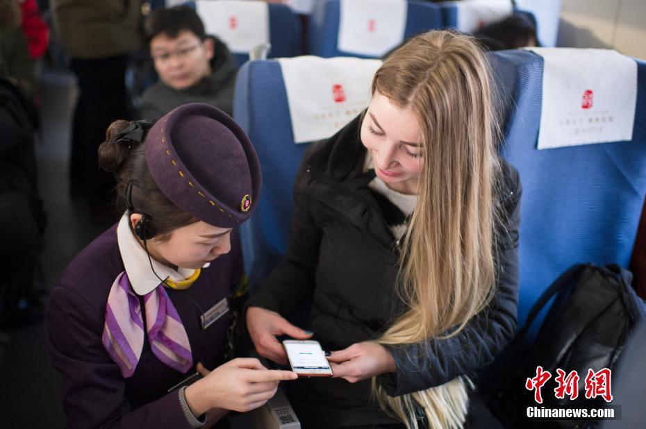 列车长在教乌克兰留学生olya lya扫码点餐。张娅子 摄