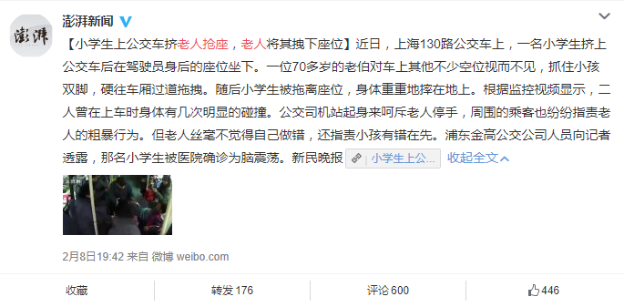 小学生上公交抢座 老人将其拽下致脑震荡