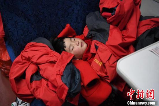 列车在夜幕中飞驰,列车里先前的喧闹声渐渐平息,归心似箭的“候鸟”们或依在座椅上,或趴在折叠桌上睡觉。