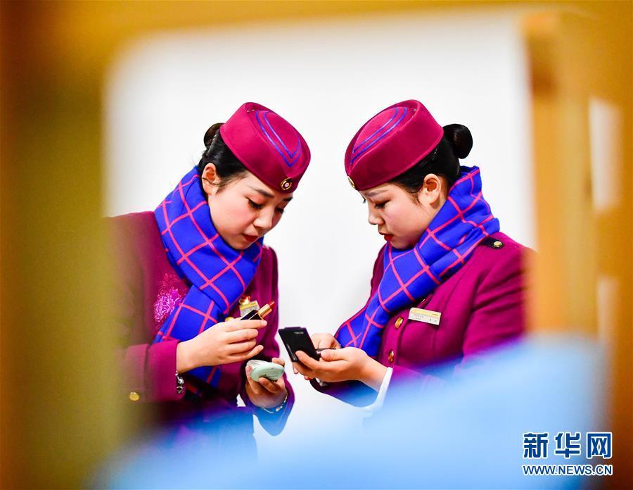 2月8日,李清(左)和妹妹李洁在休息室内相互帮助整理妆容。新华社记者 刘潺 摄