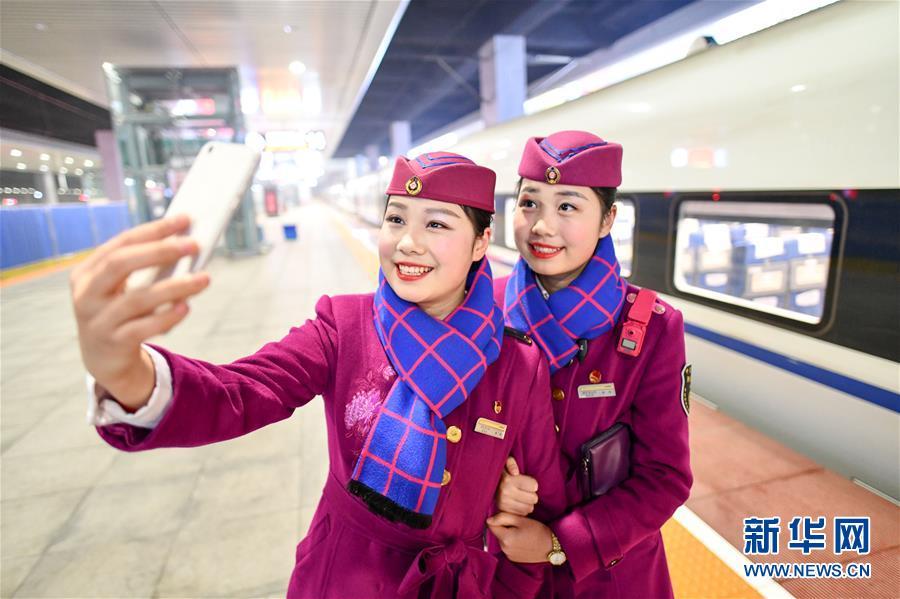2月8日早上7点多,李清(右)和妹妹李洁在准备工作结束后,利用上客前的工作间隙在站台上自拍,庆祝姐妹俩的生日。 新华社记者 刘潺 摄