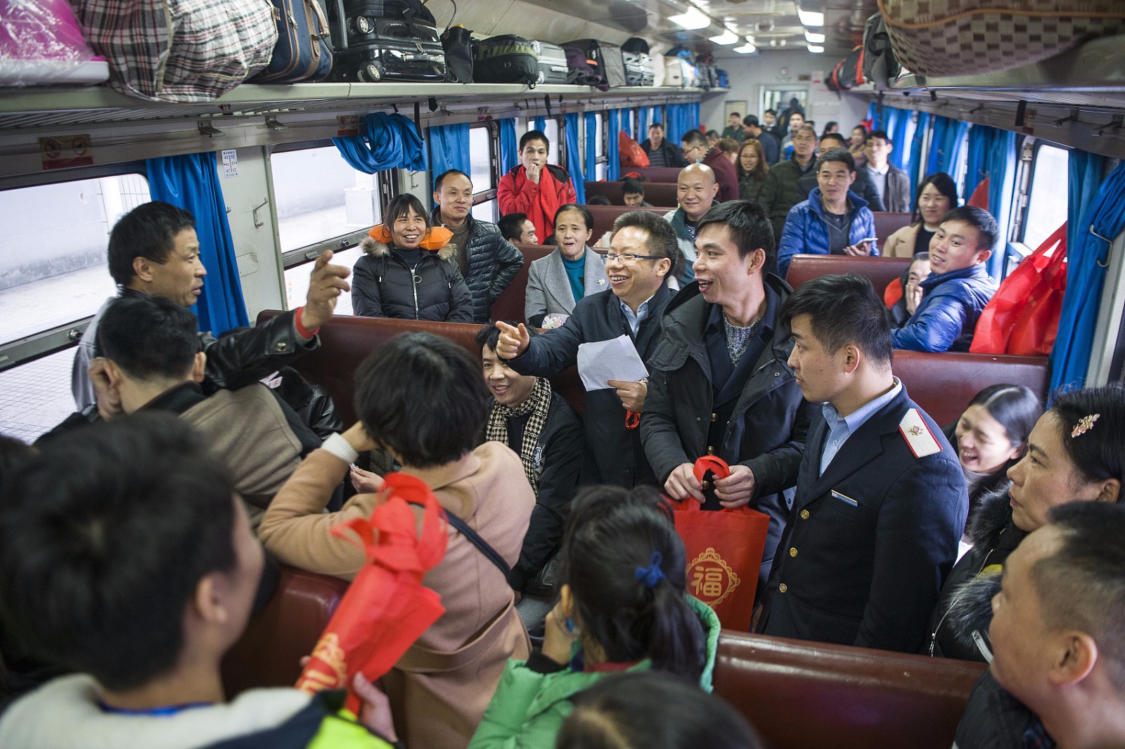 广州至邵阳的爱心专列上,邵阳驻广州团工委书记杨定明(中间带眼镜者)与乘坐爱心专列的乘客进行有奖知识问答互动,现场气氛活跃。
