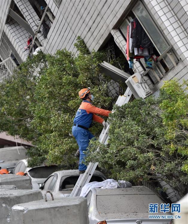 2月8日,救援人员进入倾倒的花莲云门翠堤大楼现场进行救援。截至8日上午11时,已有4名大陆游客在台湾花莲地震中遇难。负责搜救的现场指挥人员说,倒塌的云门翠堤大楼中还发现5名大陆游客被困。2月6日23时50分,台湾花莲县附近海域发生6.5级地震,此后余震不断。 新华社记者 岳月伟 摄 图片来源:新华网