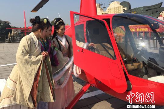 古装美女乘坐直升机穿越常州古淹城玩转“春秋”
