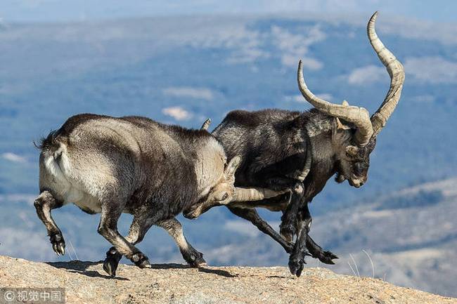 2018年2月8日讯(具体拍摄时间不详),西班牙卡斯蒂利亚-莱昂,一对雄性野生山羊在悬崖边战斗,意味着失败者将被推下悬崖,它们用强有力的角作为武器,经过20分钟的角力,最终一只山羊跳下悬崖停止了战斗。供图:Agus Nuleagus/Solent News/视觉中国