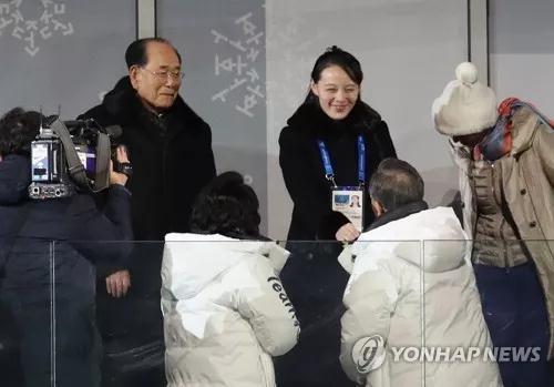 △看台上,韩国总统文在寅与金正恩妹妹金与正握手