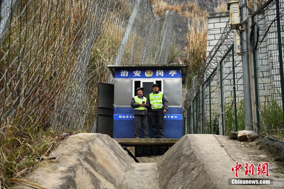 2月9日,重庆铁路公安丰都车站派出所保安队员廖小城与妻子陶春秀正在进行日常巡防工作。中新社记者前往渝利铁路绿春坝隧道口,看到旁边搭建了一个5平方米左右的治安岗亭,这就是廖小城夫妻俩工作的地方。据悉,他们夫妻俩日常主要工作就是用对讲机向下一个治安岗亭通报每一辆过往列车的行车情况。其次就是检查铁路两边封闭网的螺丝有无松动、铁路隧道外的边坡有无滑坡迹象、是否有人或牲畜进入铁路正线区域等,确保列车能安全通过站点。 中新社记者 陈超 摄