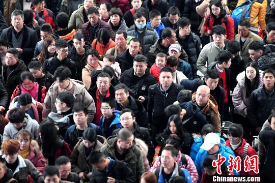 2月9日,福州火车北站旅客在候车厅排队等候检票上车。随着春节日渐临近,福州火车站迎来节前春运客流高峰。 张斌 摄