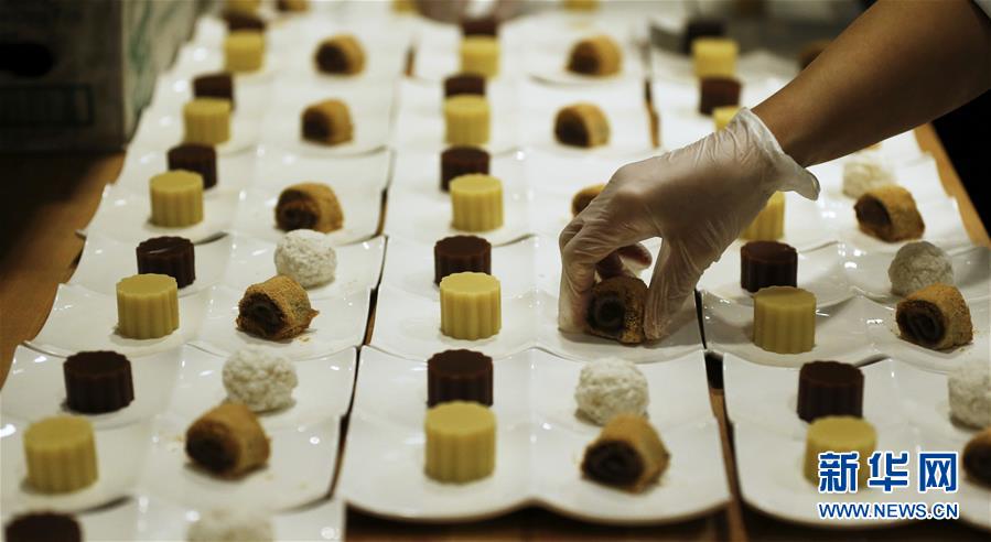 2月8日,在美国洛杉矶,厨师准备传统中式点心“驴打滚”、“艾窝窝”、“豌豆黄”和“红豆凉糕”。