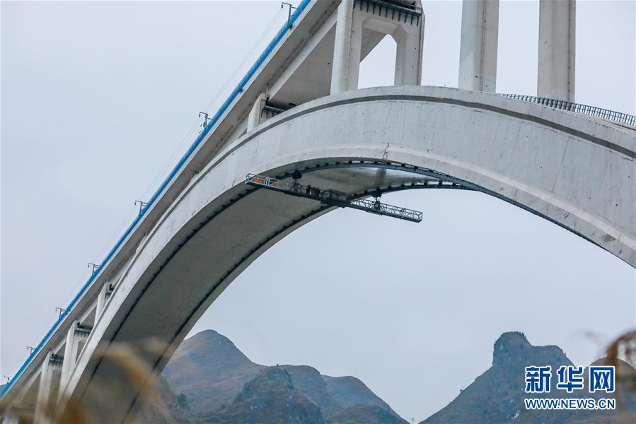 贵阳高铁工务段工作人员在检测小车上对大桥展开检查