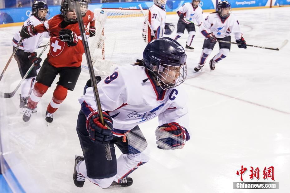 2月10日,2018平昌冬奥会女子冰球比赛开战,朝韩女子冰球联队(白色球衣)首秀对阵瑞士队,最终朝韩联队以0比8败于瑞士队。中新社记者 崔楠 摄