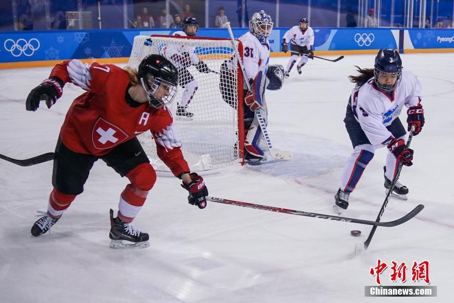 2月10日,2018平昌冬奥会女子冰球比赛开战,朝韩女子冰球联队(白色球衣)首秀对阵瑞士队,最终朝韩联队以0比8败于瑞士队。中新社记者 崔楠 摄