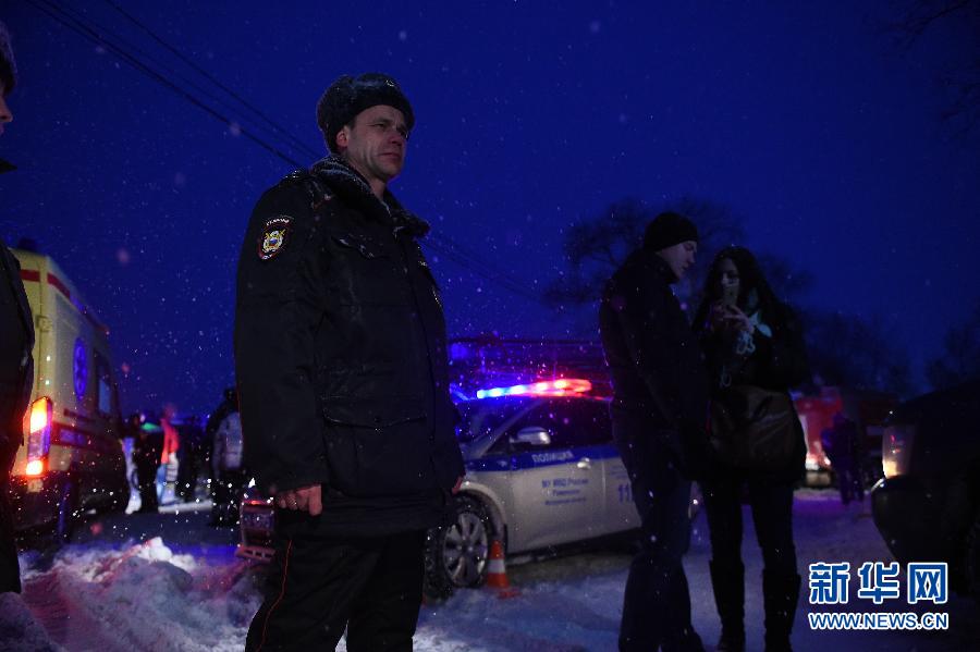 2月11日,在俄罗斯莫斯科州,警察在坠机地点外警戒。新华社发(叶甫盖尼·西尼岑摄)