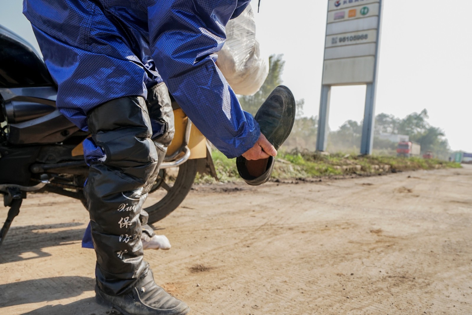 一路上,他尽量控制速度,每隔一段时间,就要停下休息片刻,活动活动筋骨,跺跺冻僵的双脚。2月初,两广地区气温虽然在零度以上,但长途骑行,寒冷依然是绕不开的困难。沿途,不少骑行者停在路边烤火取暖。