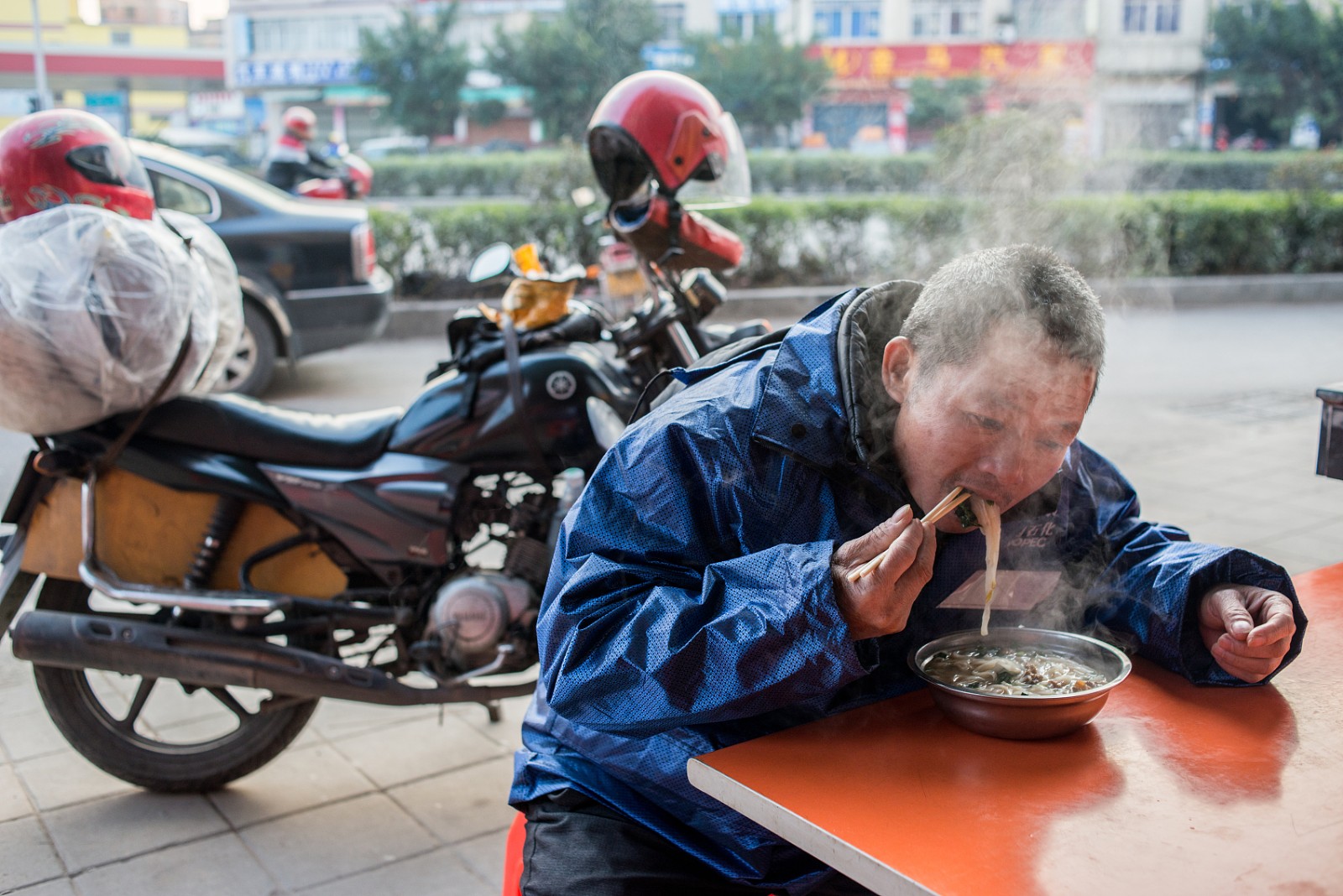 第二天早上7时30分,苏文勇准时起床,在地摊吃了碗米粉便再次上路。近乡情更切,在距离家乡还有一百多公里的时候,苏文勇明显加快了骑行速度。按照以往经验,14时左右他就能到家。但后面的路况越来越差,他需要更加集中精力。路上,他又看到了两起摩托车事故。