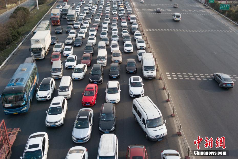 2月11日,大批车辆途经南京二桥高速收费站,由南向北驶上南京长江二桥,各种颜色的车辆组合犹如“钢铁长龙”。春节将至,各地高速公路迎来大批车流。 中新社记者 泱波 摄