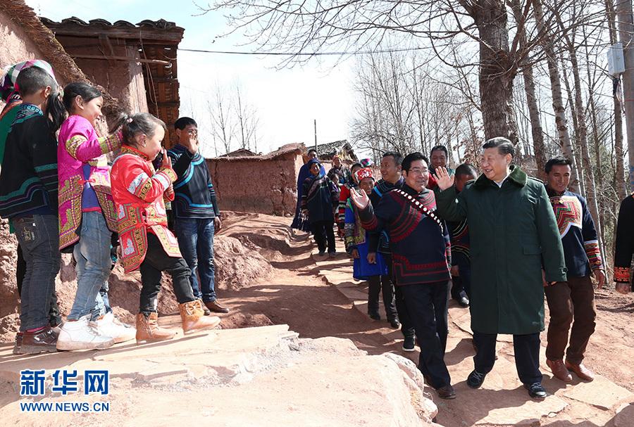2月11日,中共中央总书记、国家主席、中央军委主席习近平在四川考察。这是习近平在凉山彝族自治州昭觉县三岔河乡三河村跟孩子们打招呼。新华社记者 鞠鹏 摄