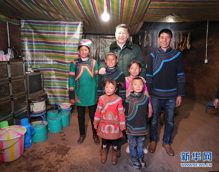 2月11日,中共中央总书记、国家主席、中央军委主席习近平在四川考察。这是习近平在凉山彝族自治州昭觉县三岔河乡三河村同贫困户吉好也求一家合影。新华社记者 谢环驰 摄