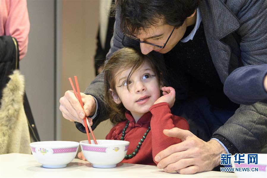 2月10日,在法国巴黎中国文化中心,一名小朋友与父亲一起练习使用筷子。10日,法国巴黎中国文化中心里张灯结彩,喜庆热闹,洋溢着浓浓的年味,400余名当地民众冒着冬日严寒前来参加“走进中心过大年”活动,共庆新春佳节。新华社记者 陈益宸 摄