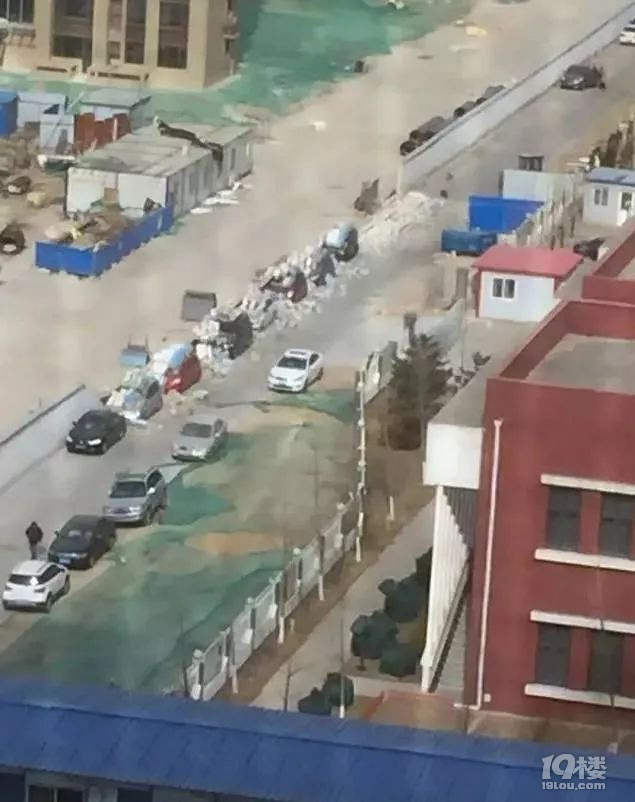 这些车辆上面全都是掉下来的大砖块,部分车辆的玻璃已经破损,车辆已经变形。