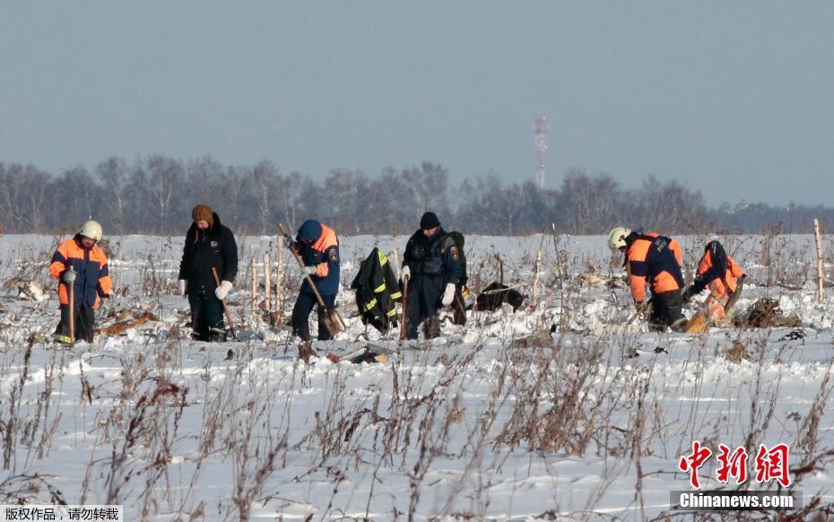 当地时间2月11日,俄罗斯萨拉托夫航空公司一架从莫斯科飞往奥尔斯克的安-148客机,从莫斯科多莫杰多沃机场起飞不久后坠毁。机上65名乘客和6名机组人员,无一生还。图为当地时间2月12日,俄罗斯紧急情况部工作人员在客机失事地点调查。