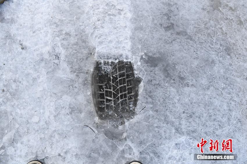 一辆车留下车轮胎陷在冰里的痕迹。张瑶 摄