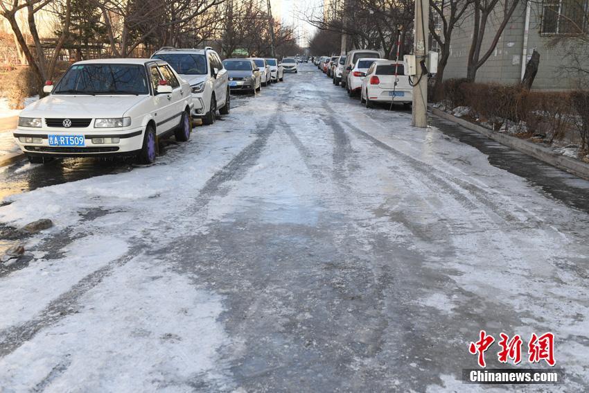 小区行车道被厚厚的冰所覆盖。张瑶 摄